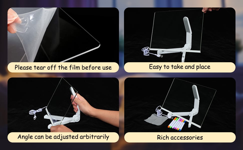 - Before using our LED acrylic erase board, please remove the double-sided protective film. Use and adjust the included foldable triangular stand and place the message board on it.